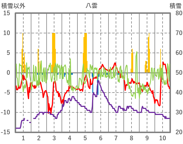 | 日 | 時 | 気温 | 降水 | 風向/風速 | 日照 | 積雪 | 降雪 |
