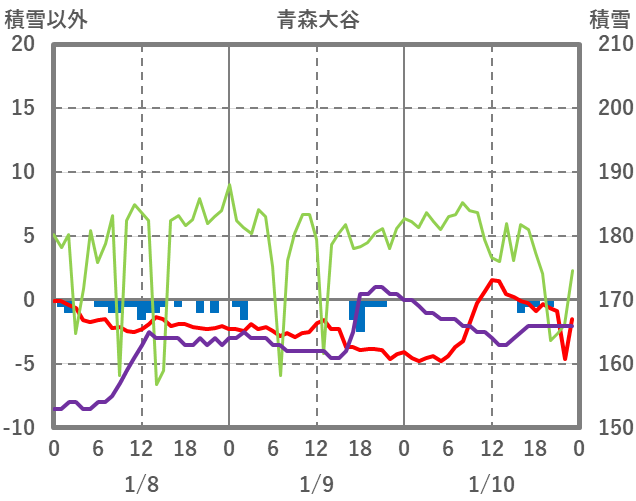| 日 | 時 | 気温 | 降水 | 風向/風速 | 日照 | 積雪 | 降雪 |