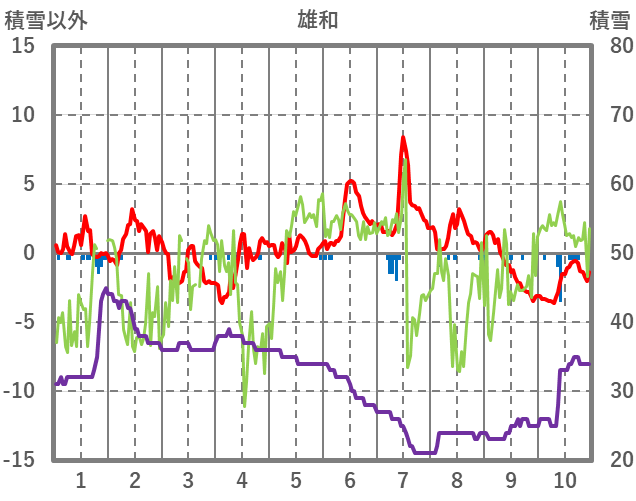 | 日 | 時 | 気温 | 降水 | 風向/風速 | 日照 | 積雪 | 降雪 |