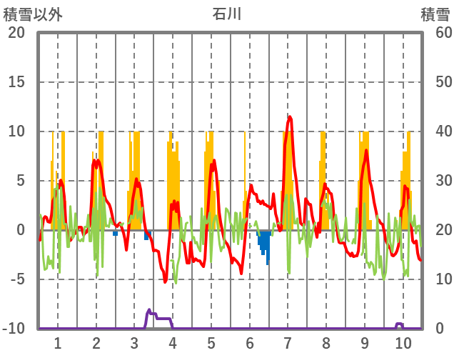 | 日 | 時 | 気温 | 降水 | 風向/風速 | 日照 | 積雪 | 降雪 |