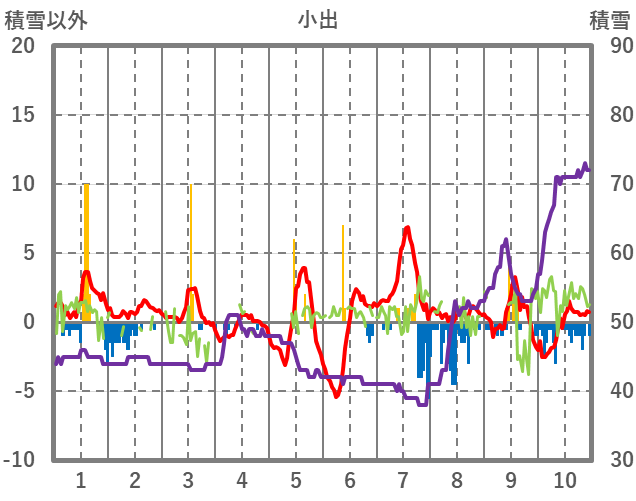 | 日 | 時 | 気温 | 降水 | 風向/風速 | 日照 | 積雪 | 降雪 |