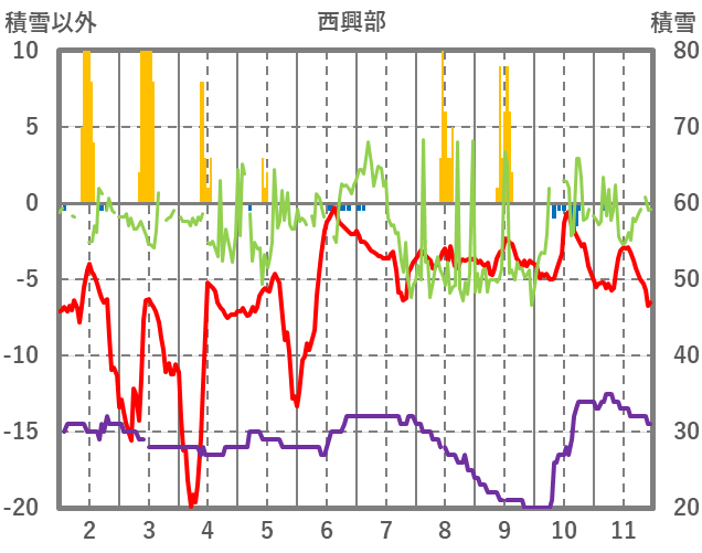 | 日 | 時 | 気温 | 降水 | 風向/風速 | 日照 | 積雪 | 降雪 |