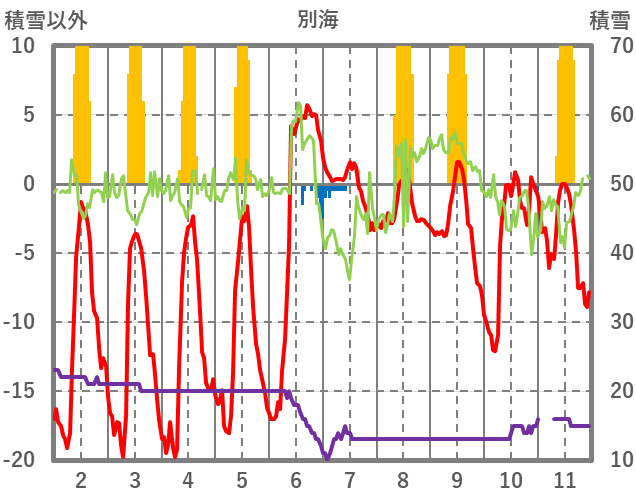 | 日 | 時 | 気温 | 降水 | 風向/風速 | 日照 | 積雪 | 降雪 |