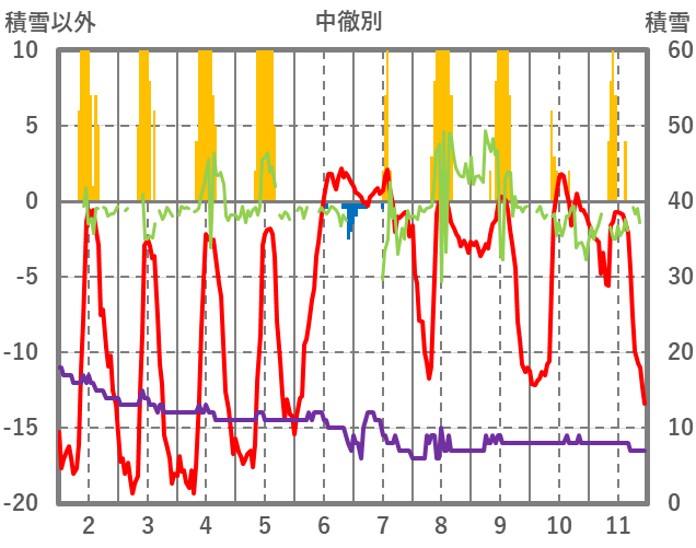 | 日 | 時 | 気温 | 降水 | 風向/風速 | 日照 | 積雪 | 降雪 |