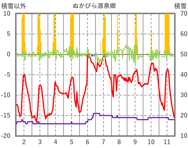 | 日 | 時 | 気温 | 降水 | 風向/風速 | 日照 | 積雪 | 降雪 |