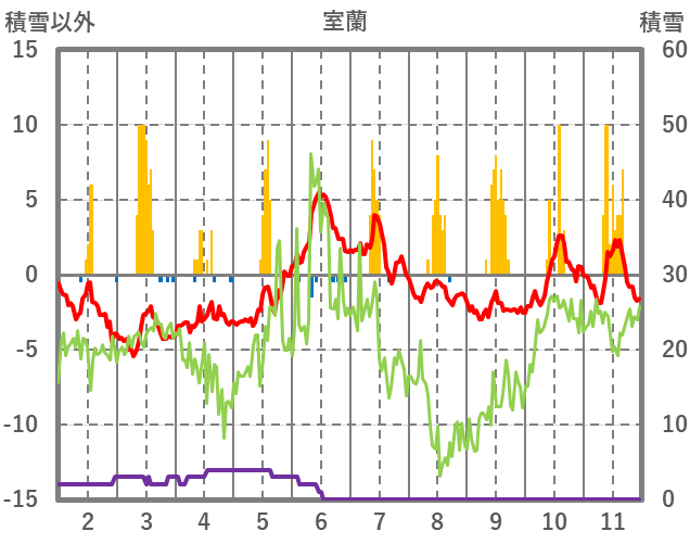 | 日 | 時 | 気温 | 降水 | 風向/風速 | 日照 | 積雪 | 降雪 |