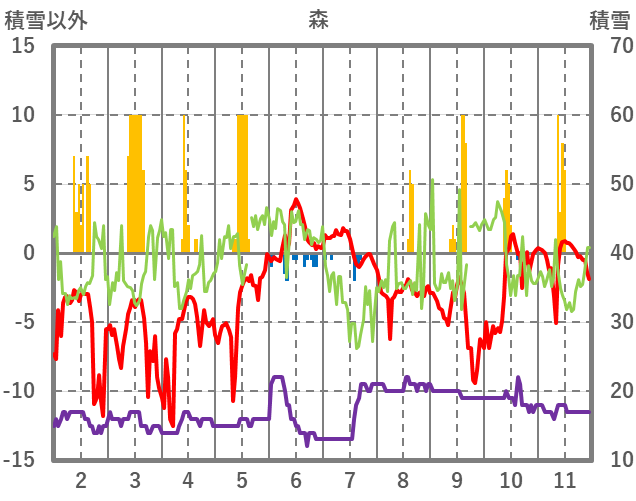 | 日 | 時 | 気温 | 降水 | 風向/風速 | 日照 | 積雪 | 降雪 |