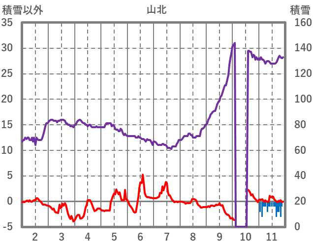 | 日 | 時 | 気温 | 降水 | 風向/風速 | 日照 | 積雪 | 降雪 |