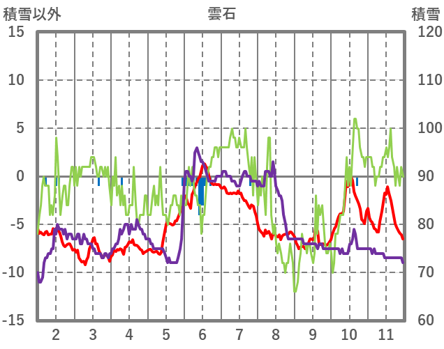 | 日 | 時 | 気温 | 降水 | 風向/風速 | 日照 | 積雪 | 降雪 |