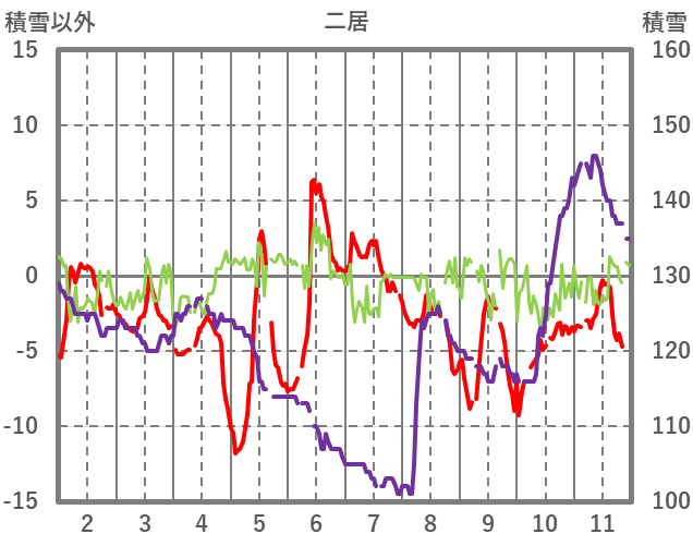 | 日 | 時 | 気温 | 降水 | 風向/風速 | 日照 | 積雪 | 降雪 |