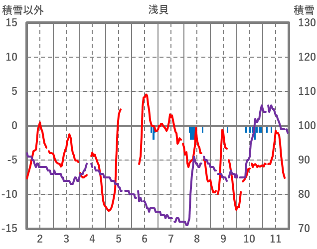 | 日 | 時 | 気温 | 降水 | 風向/風速 | 日照 | 積雪 | 降雪 |