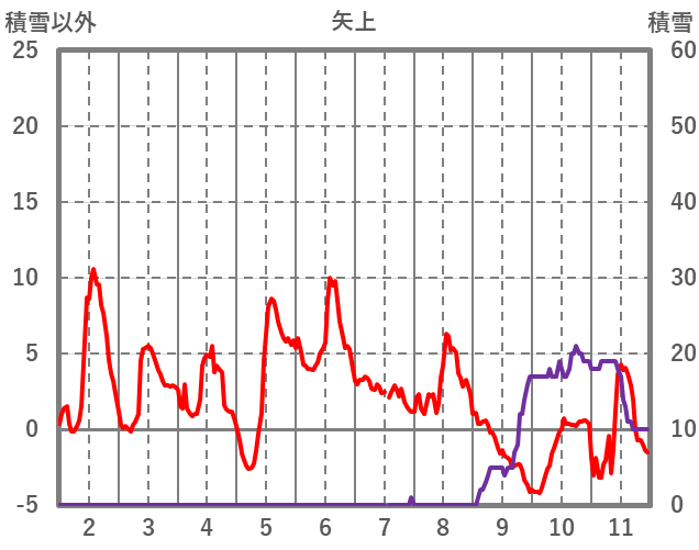 | 日 | 時 | 気温 | 降水 | 風向/風速 | 日照 | 積雪 | 降雪 |