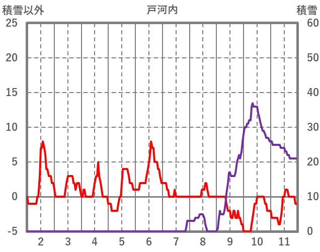 | 日 | 時 | 気温 | 降水 | 風向/風速 | 日照 | 積雪 | 降雪 |
