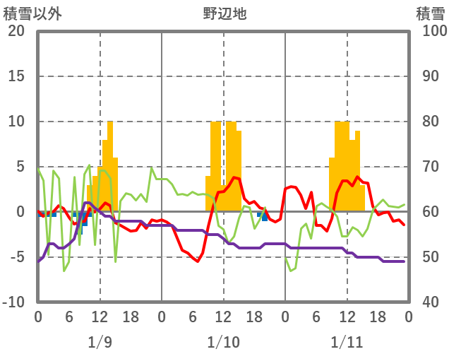 | 日 | 時 | 気温 | 降水 | 風向/風速 | 日照 | 積雪 | 降雪 |