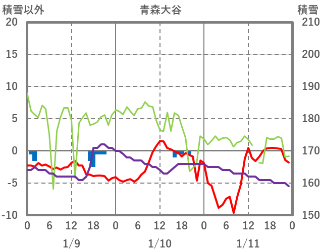 | 日 | 時 | 気温 | 降水 | 風向/風速 | 日照 | 積雪 | 降雪 |