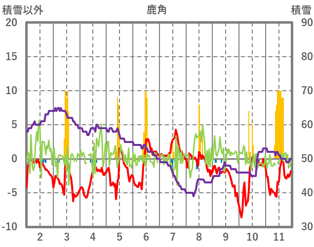 | 日 | 時 | 気温 | 降水 | 風向/風速 | 日照 | 積雪 | 降雪 |