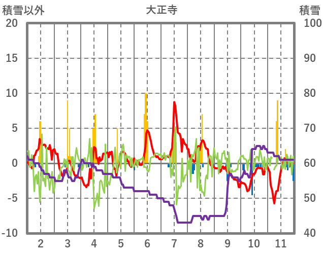 | 日 | 時 | 気温 | 降水 | 風向/風速 | 日照 | 積雪 | 降雪 |