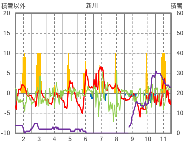 | 日 | 時 | 気温 | 降水 | 風向/風速 | 日照 | 積雪 | 降雪 |