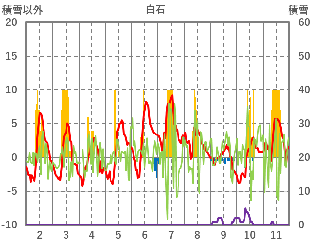 | 日 | 時 | 気温 | 降水 | 風向/風速 | 日照 | 積雪 | 降雪 |