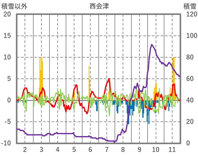 | 日 | 時 | 気温 | 降水 | 風向/風速 | 日照 | 積雪 | 降雪 |