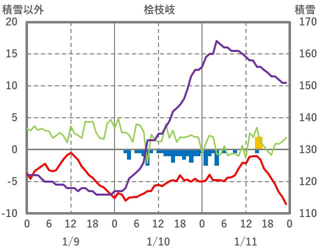 | 日 | 時 | 気温 | 降水 | 風向/風速 | 日照 | 積雪 | 降雪 |