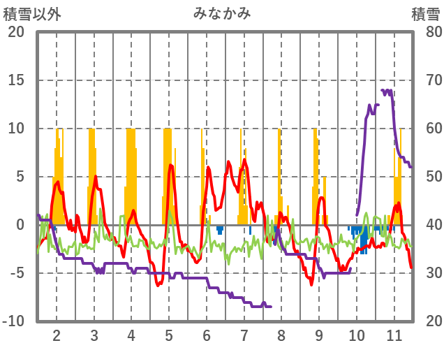 | 日 | 時 | 気温 | 降水 | 風向/風速 | 日照 | 積雪 | 降雪 |