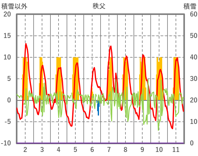 | 日 | 時 | 気温 | 降水 | 風向/風速 | 日照 | 積雪 | 降雪 |