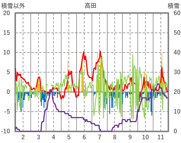 | 日 | 時 | 気温 | 降水 | 風向/風速 | 日照 | 積雪 | 降雪 |
