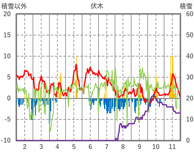 | 日 | 時 | 気温 | 降水 | 風向/風速 | 日照 | 積雪 | 降雪 |