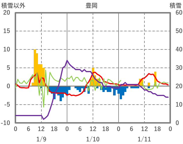 | 日 | 時 | 気温 | 降水 | 風向/風速 | 日照 | 積雪 | 降雪 |