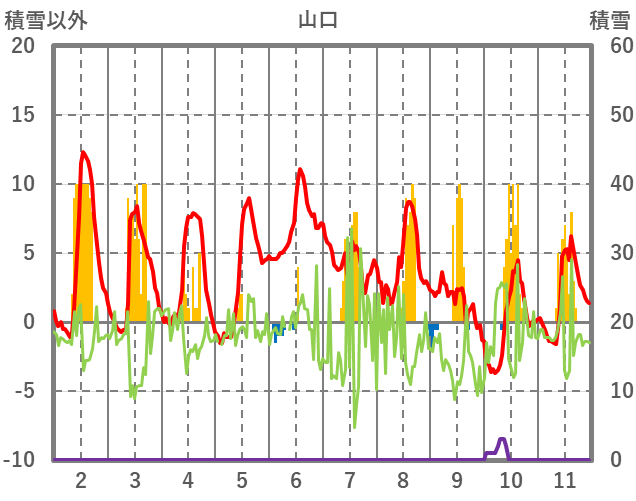 | 日 | 時 | 気温 | 降水 | 風向/風速 | 日照 | 積雪 | 降雪 |