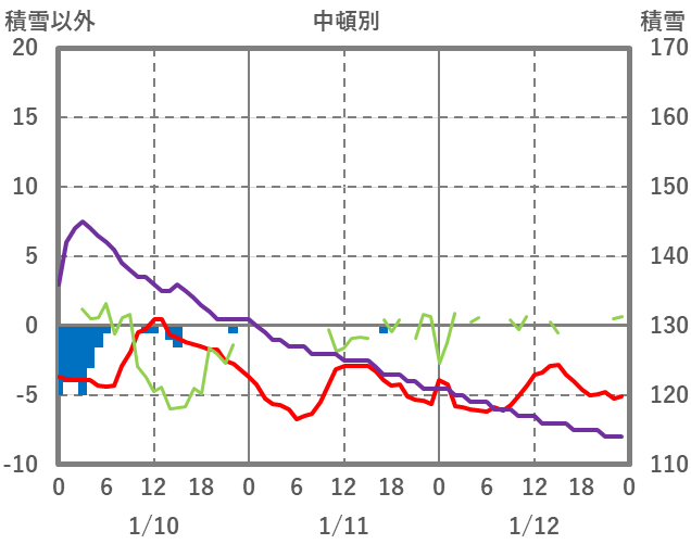 | 日 | 時 | 気温 | 降水 | 風向/風速 | 日照 | 積雪 | 降雪 |
