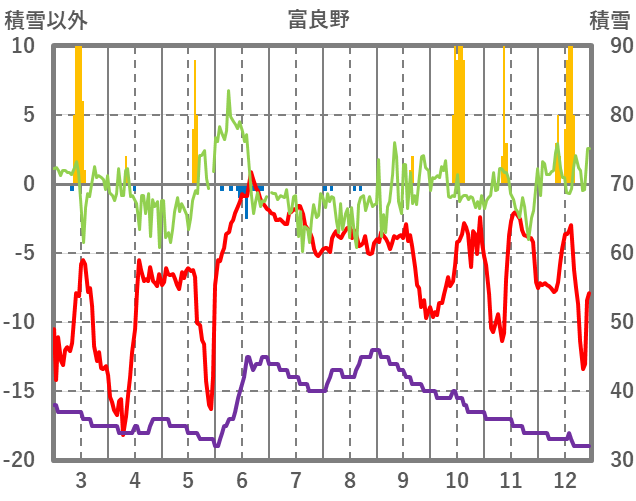 | 日 | 時 | 気温 | 降水 | 風向/風速 | 日照 | 積雪 | 降雪 |