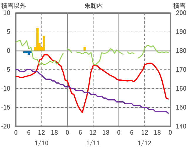 | 日 | 時 | 気温 | 降水 | 風向/風速 | 日照 | 積雪 | 降雪 |