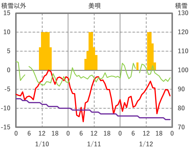 | 日 | 時 | 気温 | 降水 | 風向/風速 | 日照 | 積雪 | 降雪 |
