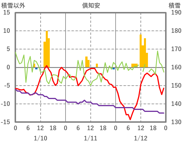 | 日 | 時 | 気温 | 降水 | 風向/風速 | 日照 | 積雪 | 降雪 |