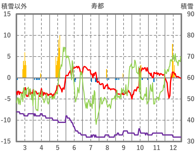 | 日 | 時 | 気温 | 降水 | 風向/風速 | 日照 | 積雪 | 降雪 |