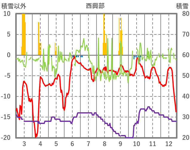 | 日 | 時 | 気温 | 降水 | 風向/風速 | 日照 | 積雪 | 降雪 |