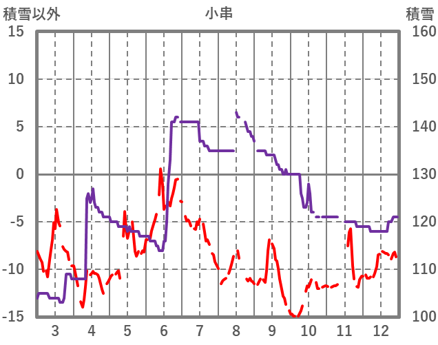 | 日 | 時 | 気温 | 降水 | 風向/風速 | 日照 | 積雪 | 降雪 |