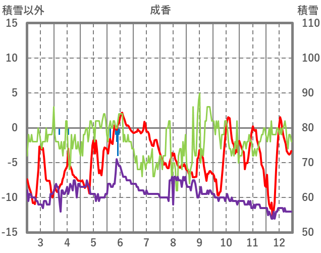 | 日 | 時 | 気温 | 降水 | 風向/風速 | 日照 | 積雪 | 降雪 |