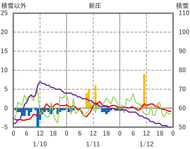 | 日 | 時 | 気温 | 降水 | 風向/風速 | 日照 | 積雪 | 降雪 |