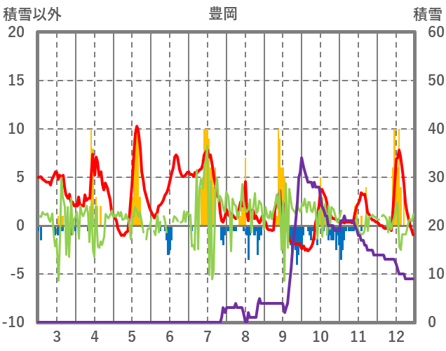 | 日 | 時 | 気温 | 降水 | 風向/風速 | 日照 | 積雪 | 降雪 |