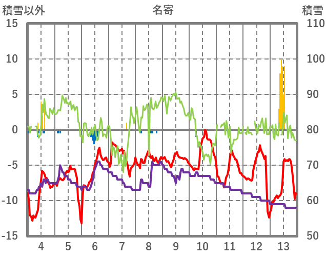 | 日 | 時 | 気温 | 降水 | 風向/風速 | 日照 | 積雪 | 降雪 |