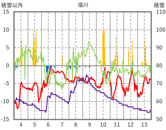 | 日 | 時 | 気温 | 降水 | 風向/風速 | 日照 | 積雪 | 降雪 |