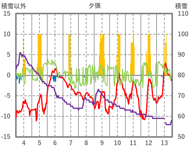 | 日 | 時 | 気温 | 降水 | 風向/風速 | 日照 | 積雪 | 降雪 |