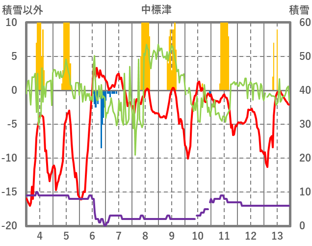 | 日 | 時 | 気温 | 降水 | 風向/風速 | 日照 | 積雪 | 降雪 |