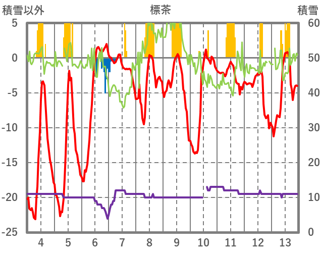 | 日 | 時 | 気温 | 降水 | 風向/風速 | 日照 | 積雪 | 降雪 |