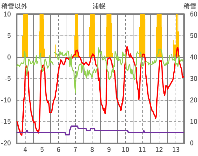 | 日 | 時 | 気温 | 降水 | 風向/風速 | 日照 | 積雪 | 降雪 |