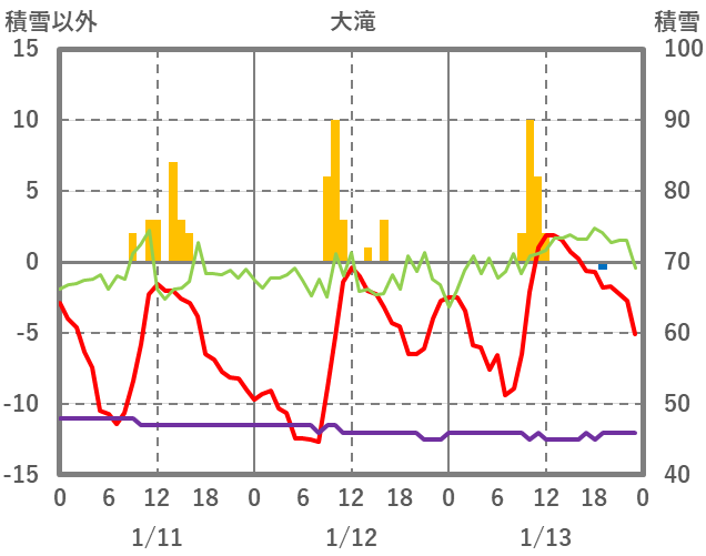 | 日 | 時 | 気温 | 降水 | 風向/風速 | 日照 | 積雪 | 降雪 |