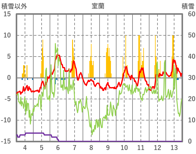 | 日 | 時 | 気温 | 降水 | 風向/風速 | 日照 | 積雪 | 降雪 |